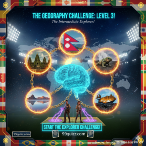 Guess the Country Quiz Guess the Country Level 3 1620saikumar@gmail.com January 25, 2026 Comments0 Guess the Country Level 3 Click the start button below to play 1 / 10 Which country is known as the "Rainbow Nation" because of its diverse multiculturalism? Australia South Africa Canada 2 / 10 Which nation is the world's largest producer of Coffee? Colombia Ethiopia Brazil 3 / 10 Which country is home to the ancient Angkor Wat temple complex? Thailand Cambodia Laos 4 / 10 Which European country is the smallest in the world by both area and population? Monaco San Marino Vatican City 5 / 10 Which Southeast Asian country was formerly known as Siam? Cambodia Thailand Vietnam 6 / 10 Which country is famous for its Shinkansen (bullet trains) and having the world's busiest pedestrian crossing? Japan China Germany 7 / 10 In which country is the world's largest salt flat, the Salar de Uyuni, located? Argentina Chile Bolivia 8 / 10 Which country is known as the "Land of Fire and Ice" due to its volcanoes and glaciers? Norway Iceland Greenland 9 / 10 Which nation is home to the Galápagos Islands, where Charles Darwin developed his theory of evolution? Ecuador Peru Chile 10 / 10 Which country is the only one in the world to have a non-rectangular national flag? Bhutan Nepal Myanmar Your score isThe average score is 0% 0% Restart quiz Explore Categories Animal Quiz 🐯General Knowledge Quiz 📖 Logical Reasoning Quiz 🧠Marvel Quiz ⚒️ WWE Quiz 💪Cricket Quiz 🏏 IPL (Cricket) Quiz 🏏Football Quiz ⚽ Guess the Country Quiz 🌍